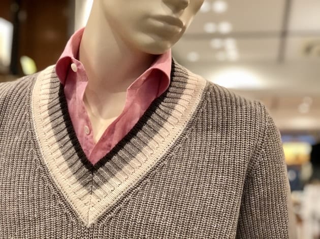〈GRAN SASSO(グランサッソ)〉のチルデンニットです。往年のテニスウェアから派生した、スポーティーでありながらトラディショナルな雰囲気が今の気分のチルデンニットは、その配色に注目を集めています。深いVネックも象徴的ですが、なんと言っても一番気になるのはボディーとラインのカラーコンビネーション。濃淡の強いかつてのコンビネーションも魅力的ですが、現代風にアップデートした都会的で落ち着いた、一言で言うと“使いやすい”カラーコンビネーションが最大の魅力です。通常、マネキンには48サイズ、または46サイズを着用させますが、店頭にあるサイズ都合を逆手に、50サイズを着せてややリラックスした雰囲気を出しました。