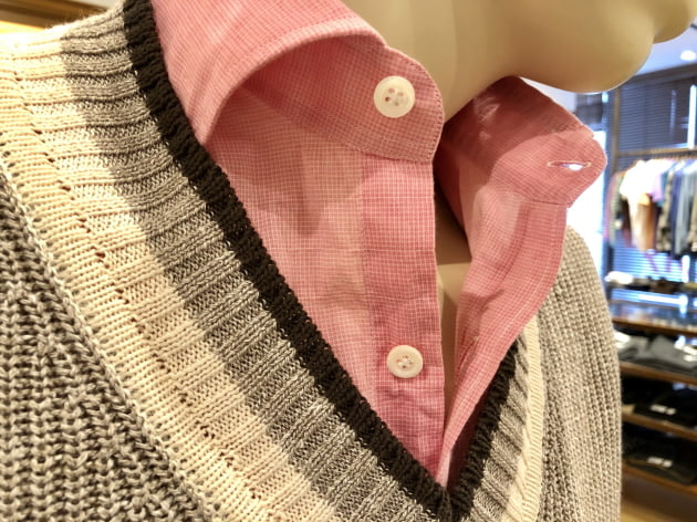 2018秋冬にチルデンニットが登場して以来、一貫してTシャツをインナーにしたスタイリングをよく見かけますし、私もよくします。しかし、シャツやポロシャツをインナーに、時にはタイドアップしても何の問題もありません。今回は、主張の強いベリーカラーが印象的な〈GIANNETTO(ジャンネット)〉のピンチェックシャツが華を添えます。決して万人受けするような色ではないものの、差し色程度の面積ならば取り入れやすいかもしれません。暑くなってニットを脱ぐと、タックアウトも可能な着丈に別注、脱いだニットは肩に掛けたり腰に巻いたりして、一種のアクセサリー感覚でもお楽しみいただけます。