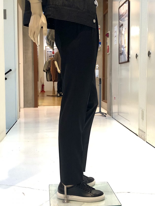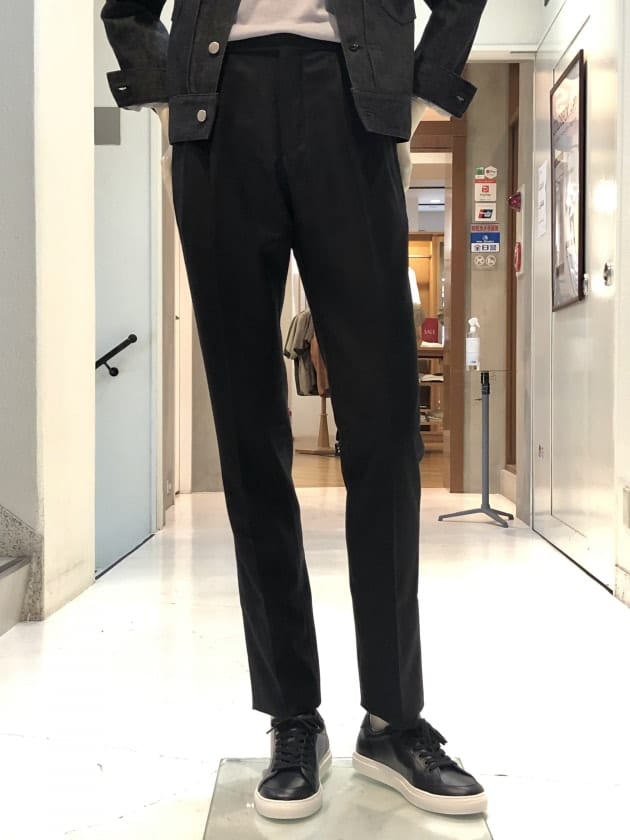 〈GTA(ジーティーアー)〉のベルトレスパンツモデルHERRICK(エリック)です。ウールサキソニーの上品なタッチ、クラシックなディテールながらモードの空気を纏うブラックが、スニーカースタイルまで網羅してしまう万能っぷり。本当に頼れるHERRICK兄さんです。