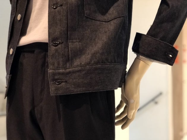 着丈が絶妙に長く設定されているのは、大人の着るデニムジャケットとしてはとても嬉しいポイントかもしれません。裾の帯部分は驚異の幅6.5㎝。全体から感じる重厚感は、どっしり支えるこの裾にあるのかもしれません。