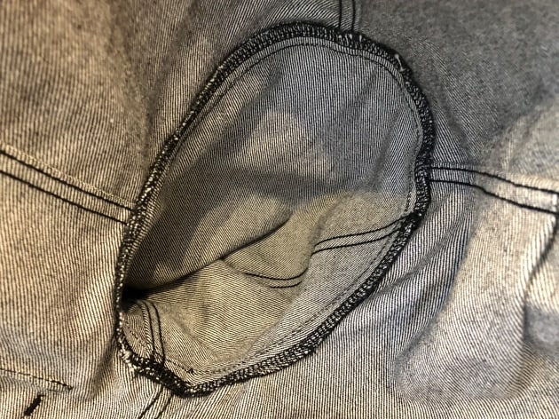 何の穴…?。アームホールです。丈夫で効率よく大量生産が取り柄のデニムジャケットに、まさかの袖を後付けという一手間。前に振って縫い上げられた袖は、着ている事を忘れてしまうほどの快適な腕の動作を保証します。