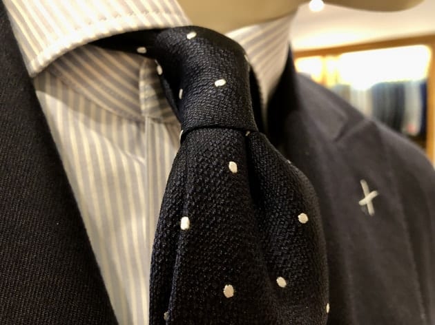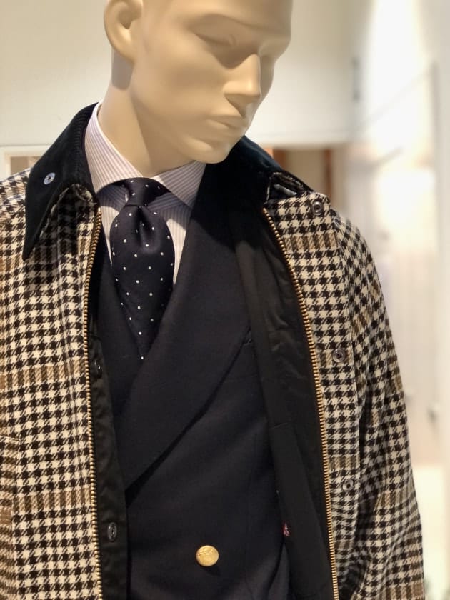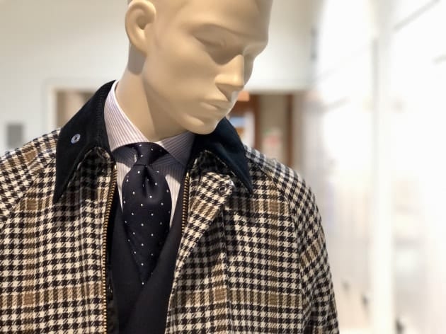 オンラインショッピングではハウンドトゥースとご紹介していますが、正確にはシェパードチェックです。ホワイト×ブラックのシェパードチェックに合わせたブラックコーデュロイの襟が、大胆な柄を調整するかのようにドレス顔へと引き締めてくれています。