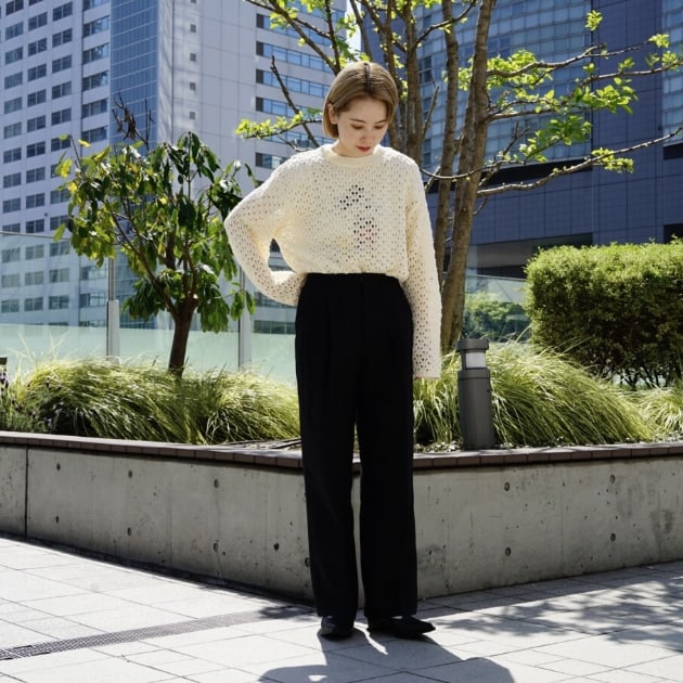 コンパクトな丈感なので、ボリュームのあるワイドパンツなどの合わせがおすすめです◎