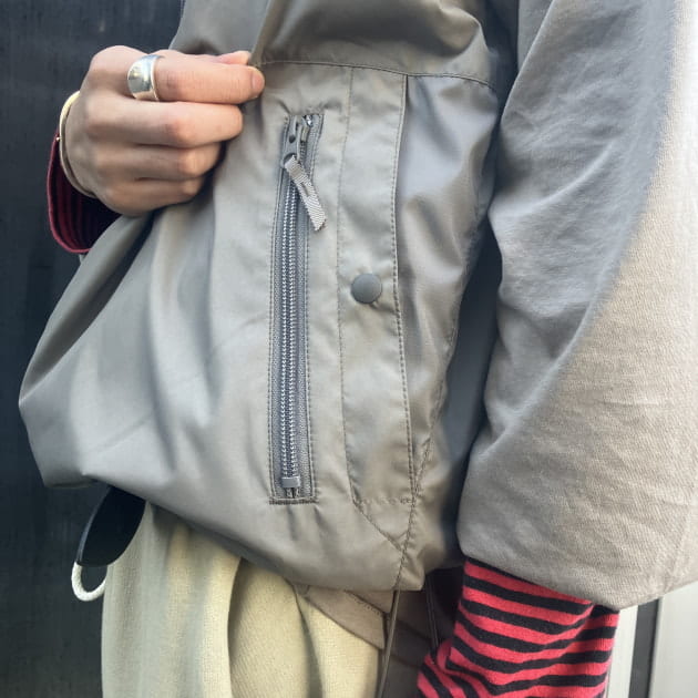 光沢感と軽量感に優れたタフタ生地と、強度が高くほつれにくいリップストップ生地を融合させた、良いとこ取りなアイテムとなっております。