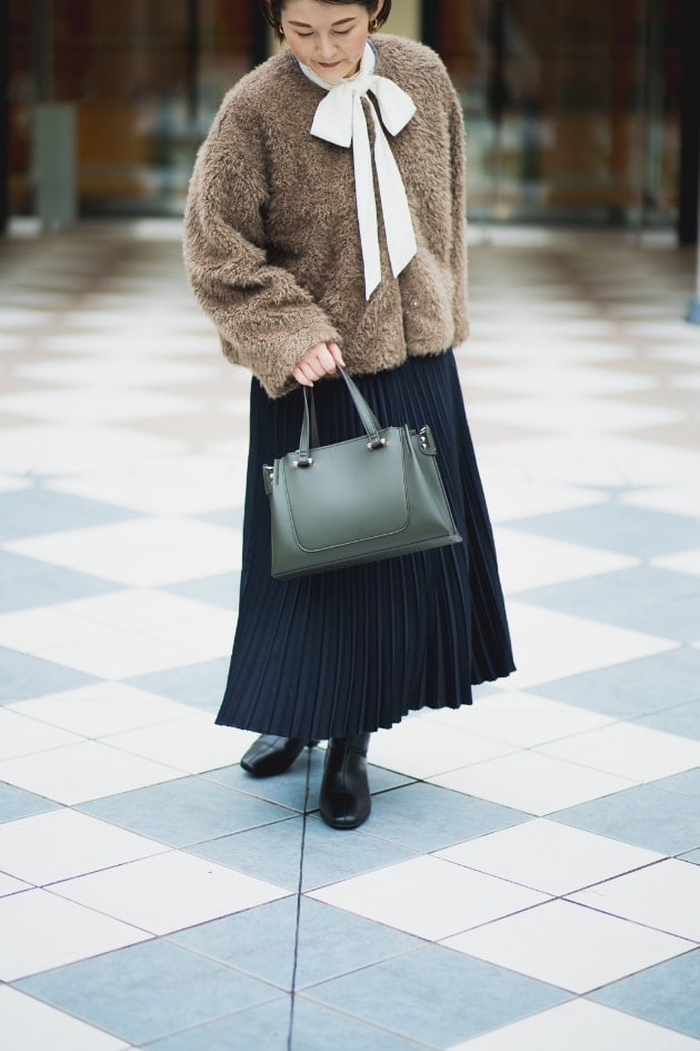 ダークなトーンで統一された小物でコーディネートを引き締めて、大人っぽく仕上げました。