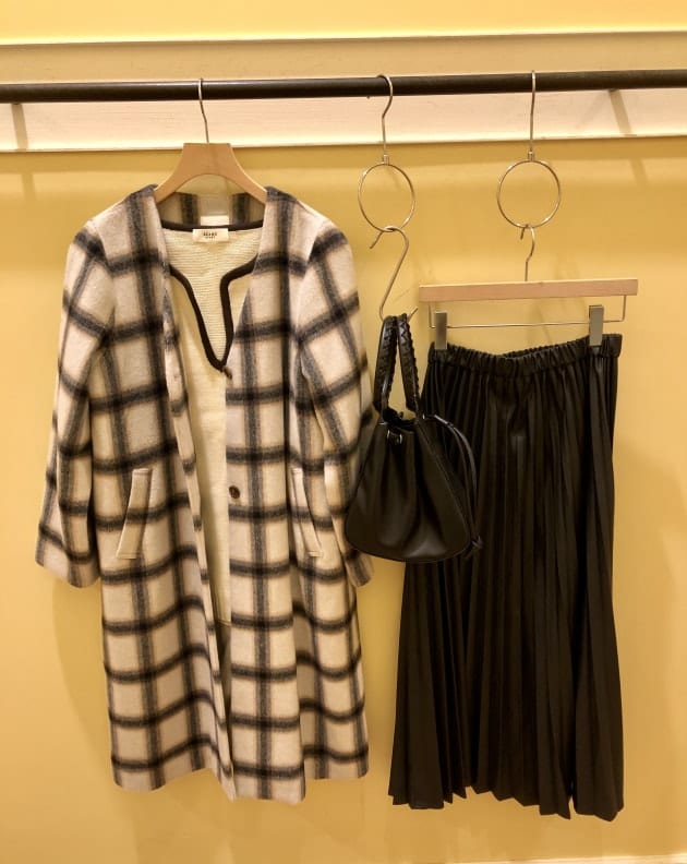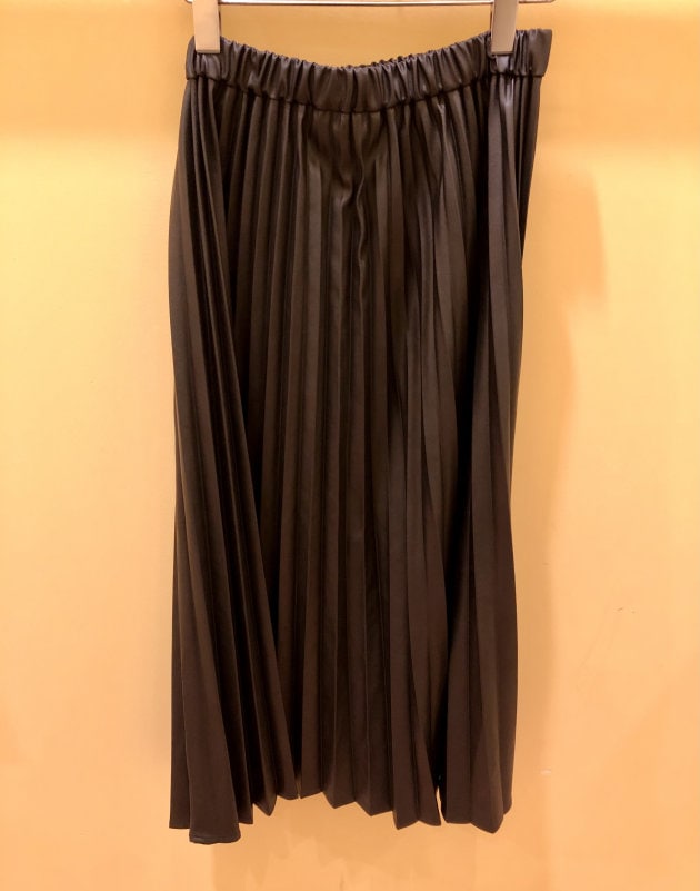 上品なクールさを演出!トレンドなレザーアイテムをプリーツスカートで☆エコレザーを使用しているのもポイントです!