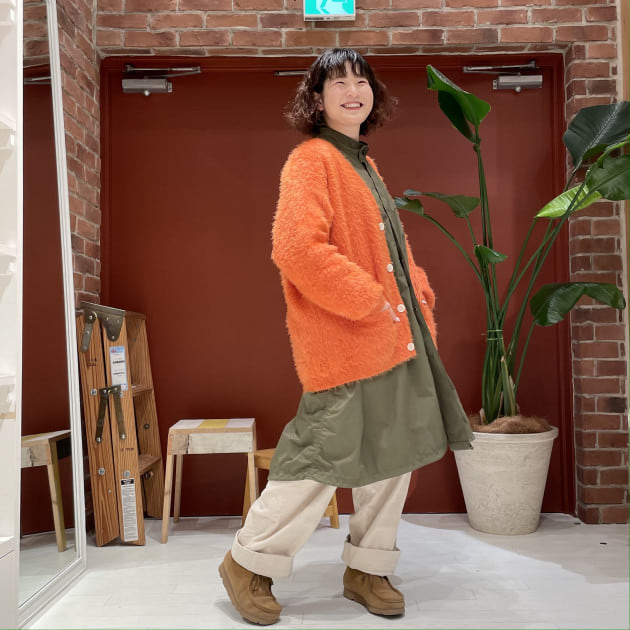 身長が151センチのクラちゃんだと膝下の丈感になります。あえてダボっとしたパンツと合わせるの良いですね!素敵!