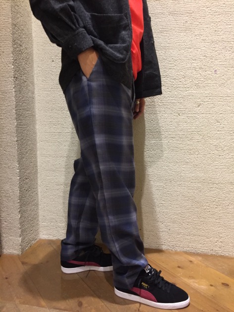 オンブレチェック柄のテーパードパンツはゆったりしたテーパードです。