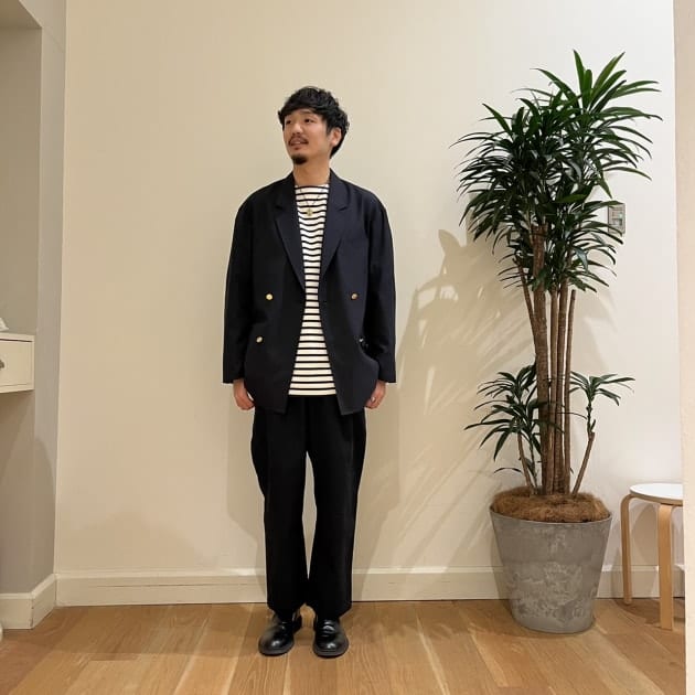 ジャケットパンツスタイルの王道パターンにボーダーで少し遊びを残したスタイリングです。