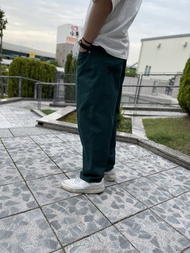 落ち着いた色の緑で、他のグリーンのパンツ