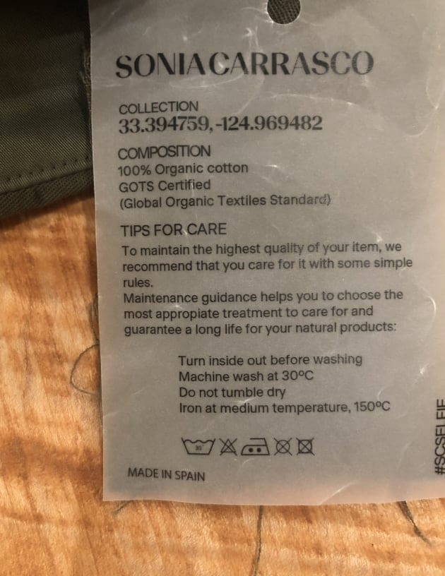 さらに、タグを見てもわかるように、〈SONIA CARRASCO〉の生地にはGTOS(オーガニックテキスタイル世界基準)認証済のオーガニックコットン、オーガニックウールを100%使用しています。
