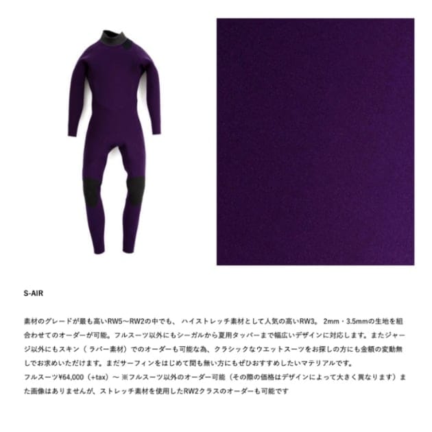 まだサーフィンをはじめたばかりでそこまで本格的なWETSUITSを作るのはちょっと、、、といった不安がある方や、これからはじめたい!と意気込む方におすすめなのが、このS-AIRというジャージ素材。かと言って、素材があまり良くないと思っているのならば、それは大きな間違いです。そこはRASH WETSUITS.CO、この素材でも後悔はさせない十分な機能性を発揮してくれます。