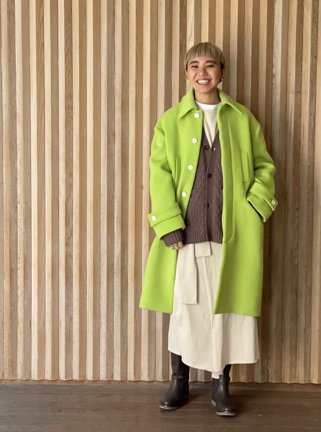 少し大きめな襟と比翼仕立てのフロント部分はビタミンカラーで目を惹く華やかさの中に上品さがあります。首元に見えるホワイトのボタンもポイント。縦横に配置された印象的なポケットは個人的にはオーバーサイズながらもスッキリ見えする絶妙な位置に配置されているところも気に入ってます。