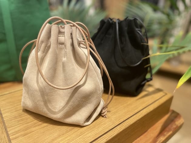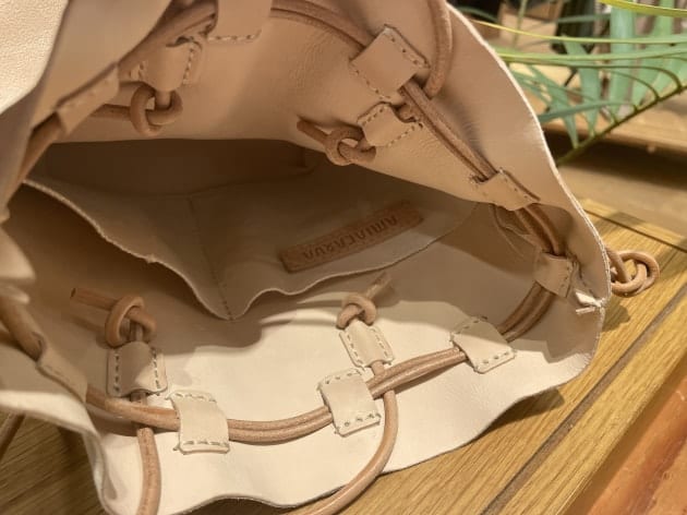 またこのタイミングで新規で入荷した巾着バックはしっかりとした厚みのある牛革素材。タフでありながらきめ細かく滑らかな質感も魅力。内側にコーマキャンバス地のポケットが2つ付いているので、鞄の中身もきれいに収納できます。