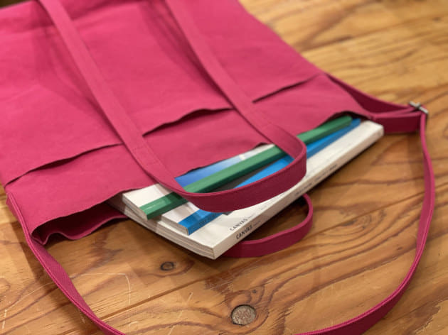 ちらっとお伝えした深めのポケットですが、実は、初代別注作成時に、画材や筆など、ARTの分野で使うあらゆる道具が綺麗に収まるサイズ感をイメージして作られたのがこのトートバッグのMサイズ。ショルダーストラップも重たい荷物の持ち運びで肩がけもできたらうれしいとの思いで付けられました。