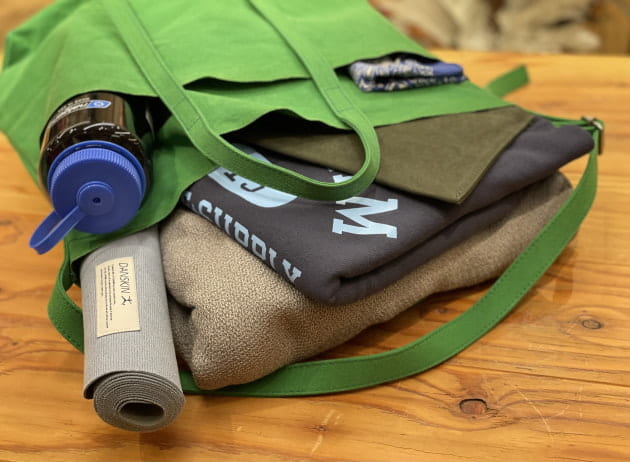 今回はヨガマットやブランケット、nalgeneボトル(1ℓ)やスウェットなど、アクティビティに持っていけるアイテムを入れてみました。