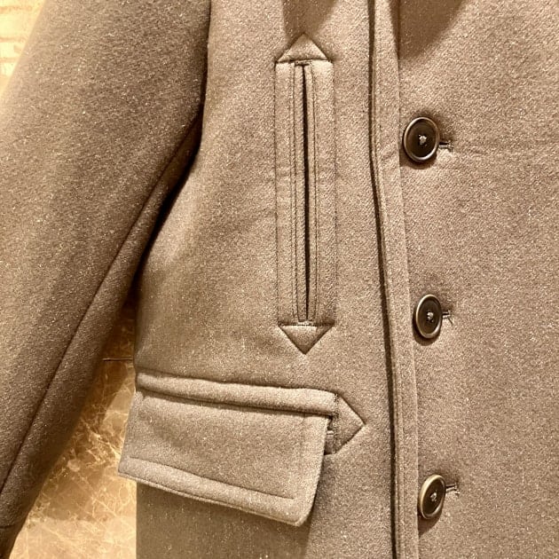 ただ復刻するのではなく、モダンに着こなせるようにハンドウォームポケットや、現代的な襟の形状、ダブルの打ち合わせなど細部までこだわってデザインされています。