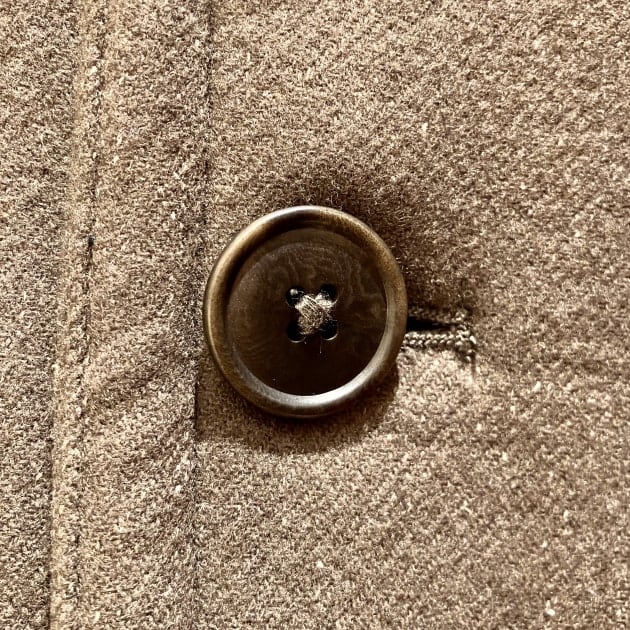また素材にはSuper140'sのウールを使用。二重織でヘリンボーンメルトンを織り、縮絨したのち毛を立たせ剪毛で刈り取りまた起毛させた繰り返すことでビロードの様な滑らかな表面に仕上げております。