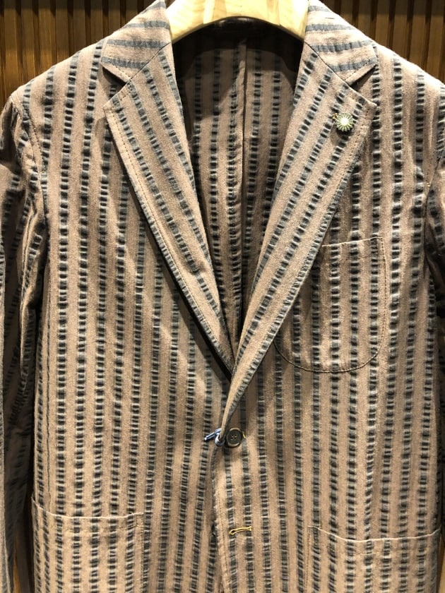 やや間隔の広い太目なストライプ柄が落ち着いた色調ながらも主張をしていて、羽織るだけで様になるかと。