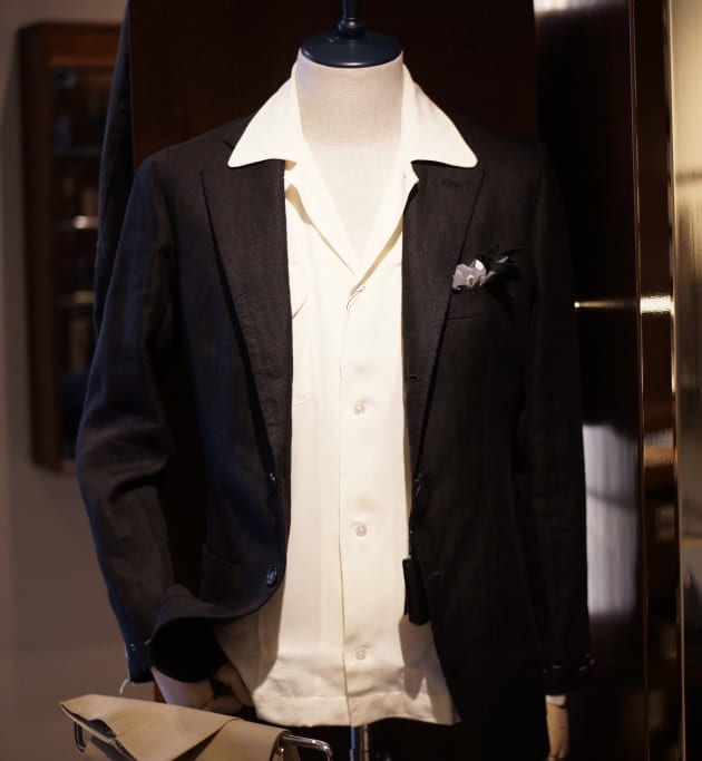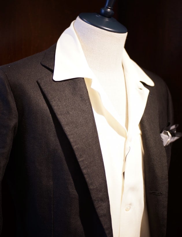 一枚で袖を捲って着るのも良いですが、サルト仕立てのジャケットのインナーに着るのがおすすめ。