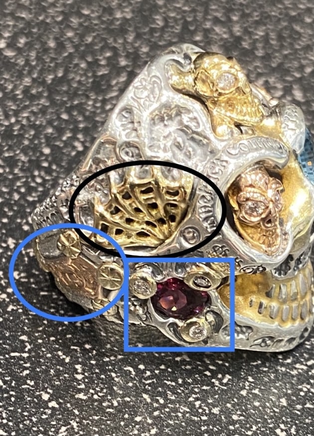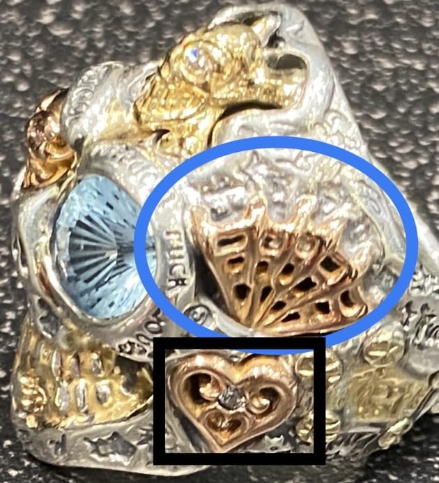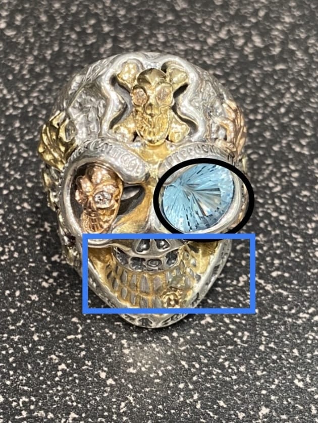 B: 青丸部分の額の小さなスカルです。こちらの両目に入ったストーンの種類をお選び頂けます。ナチュラルストーンの種類の中からとなります。現状はダイヤモンドがセットされています。※ナチュラルストーンについては最後に纏めてご説明致します。