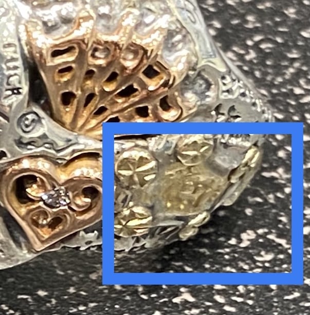 C: Bに同じく青丸部分の小さなスカルです。このスカル自体の素材をAに同じくGOLDの3種類からお選び頂けます。現状はイエローとなります。