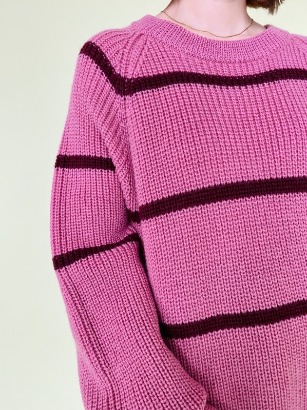 ブリティッシュウール100%で、厚く編み立てており、ウォーム感を感じる1着。
