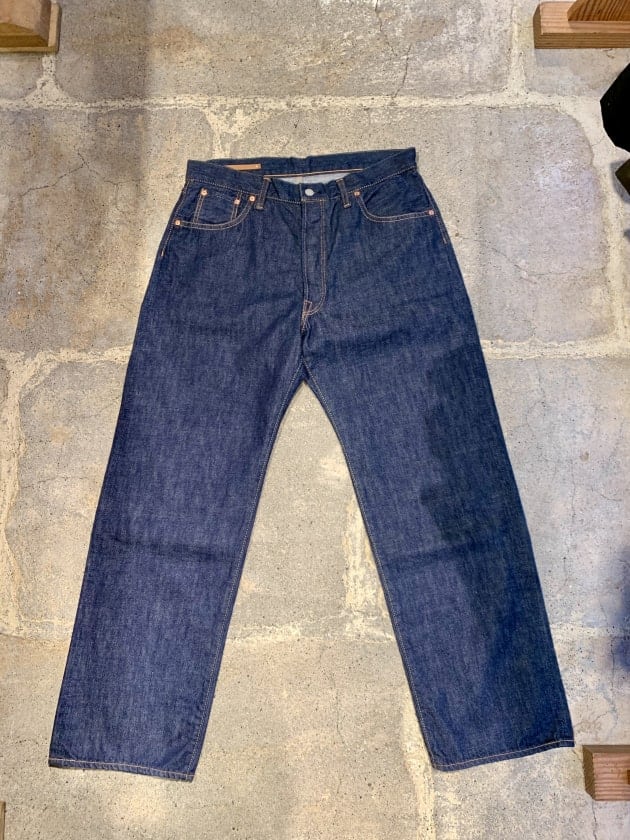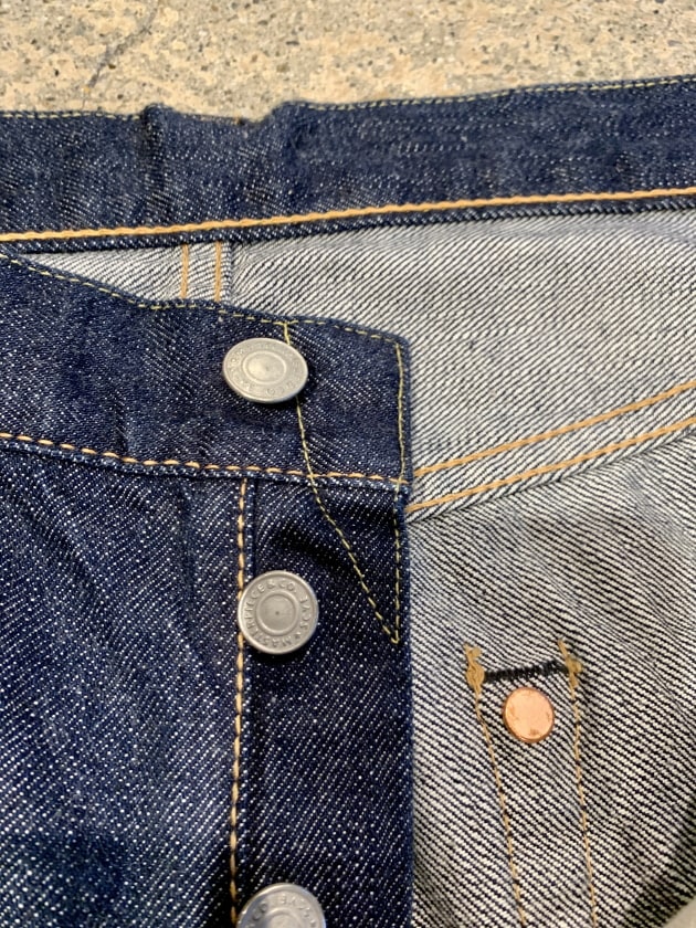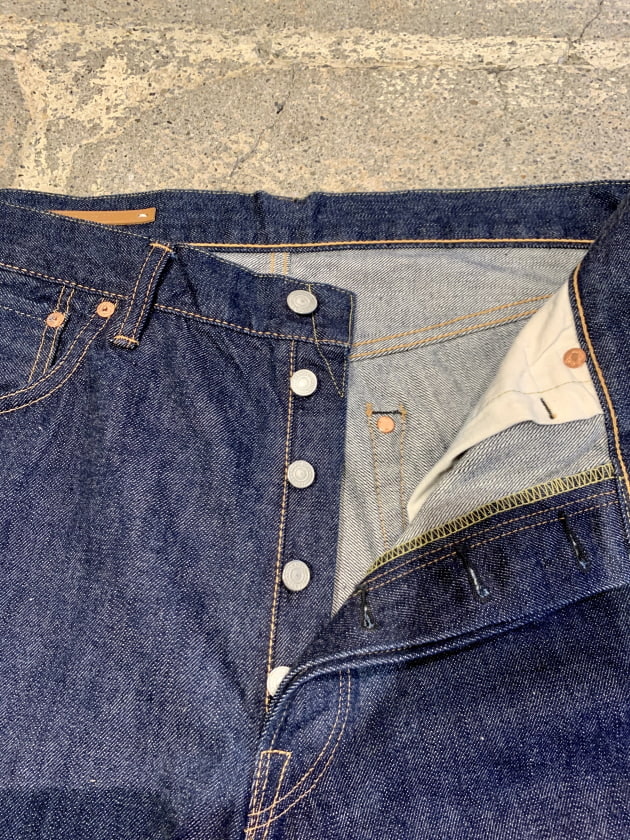 伝統を感じるボタンフライ仕様。トップボタン横のVステッチや、腰裏シングルのステッチ処理から、60年代後半以前のヴィンテージデニムの工程を重んじて丁寧に作られていることが見てとれます。