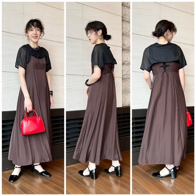 Iラインでスッキリした印象のワンピースには、このようにふわっとしたデザインを上から重ねることでまた違った気方を楽しめます!