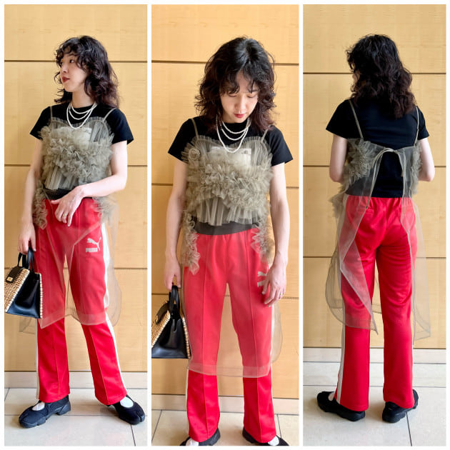 まずはじめに、ノースリーブワンピースにネットのような網状のトップスを合わせたレイヤードスタイル。