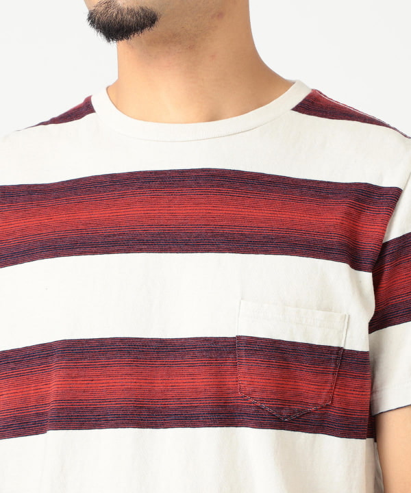また、塩素なども全く使用せず、「ロープ染色」をすることで濃い色目になり経年による自然な色の変化が楽しめます。ボーダー柄は、ネイティブアメリカンのラグマットを彷彿させるようなカラーバランス。