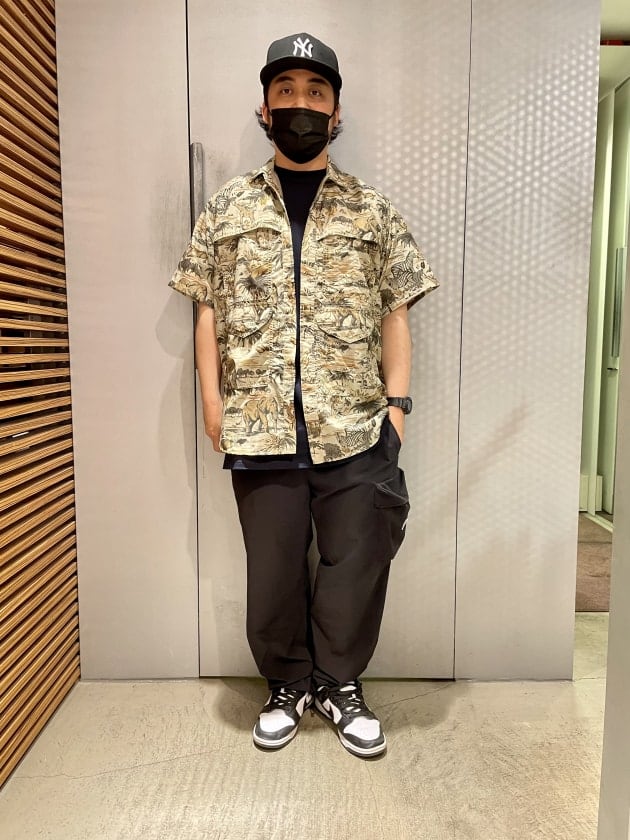 BEAMS PLUSより新作のモナリザ プリント ショートスリーブ アドベンチャー シャツⅡを使用したスタイリングです。