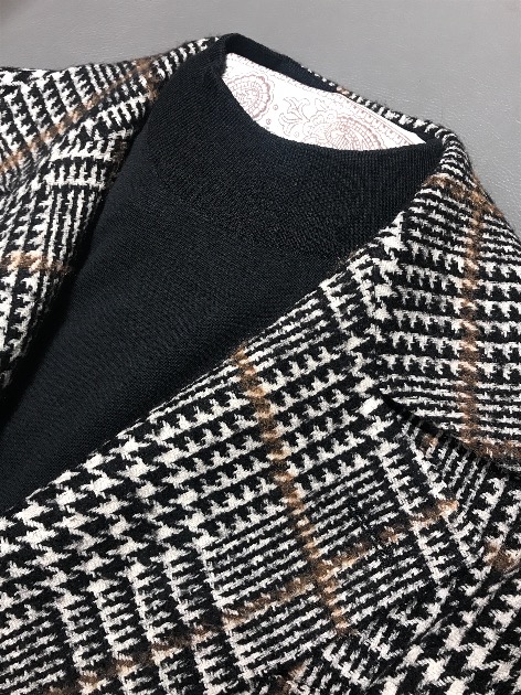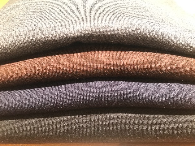 こちらが、噂の30ゲージメリノウールモックネックニットでございます。別注でスリムフィットにしております。ジャケットの下でも丁度良く着用出来ます。