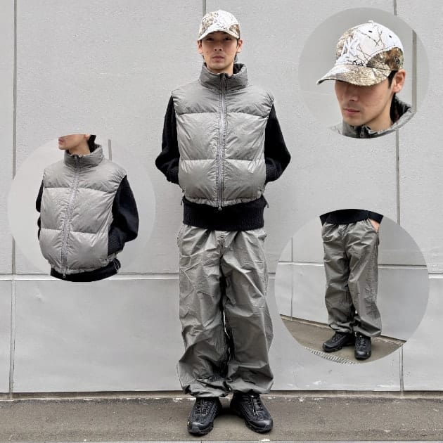 今回は、ナイロン素材を中心にまとめたグレートーンのワントーンコーディネートをご紹介。
