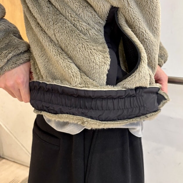 ふっくらとしたPOLARTEC®社のハイロフトフリース素材は、見た目にも暖かく、実際に袖を通すと軽さと柔らかさに驚かされる一着です。