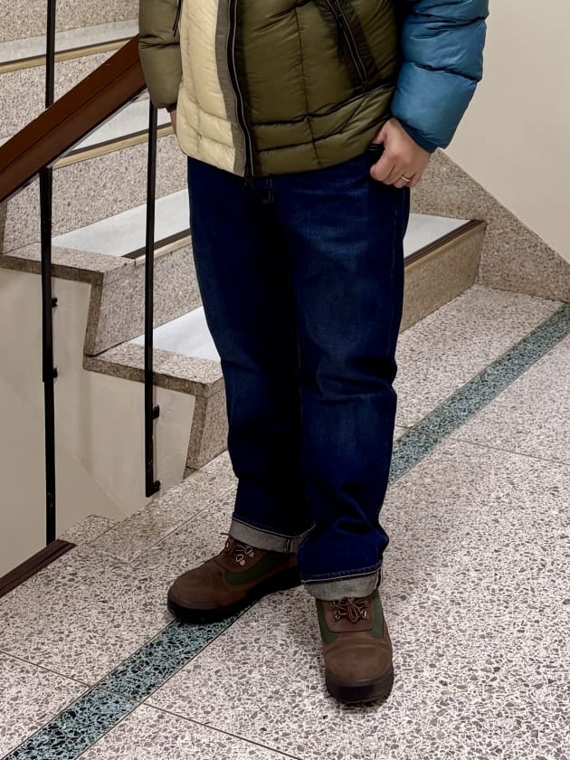 こちらのストリートな雰囲気のコーディネートには28インチのレングスで、シューズにたまり過ぎない軽めな雰囲気で着用しております。