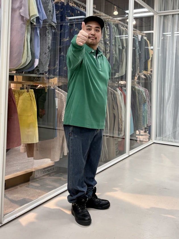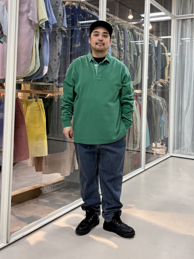 トップスに使用しているのがChampion(チャンピオン)×BEAMS(ビームス)の別注Rugger Shirtとなっており、程良いゆったり感と、ヴィンテージ感のあるカラーリングが特徴的なアイテムです。