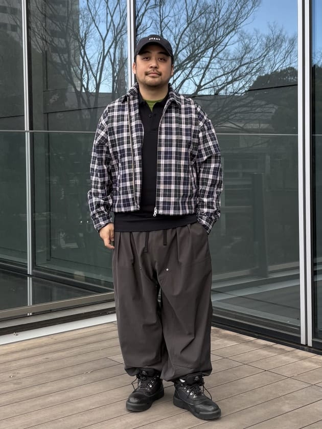 トップスにチェック ジップアップ ブルゾンを使用したスタイリングです。