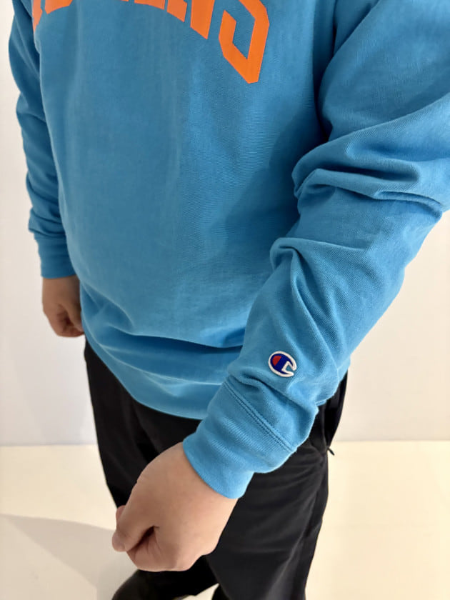 ブルーのボディにオレンジのロゴが特徴的で、左袖にはChampionのブランドロゴが刺繍されております。