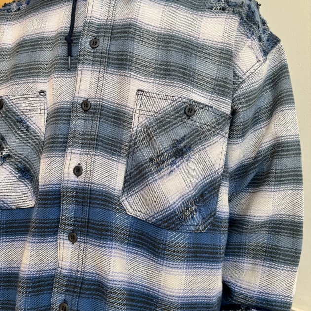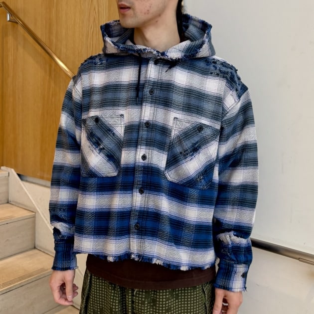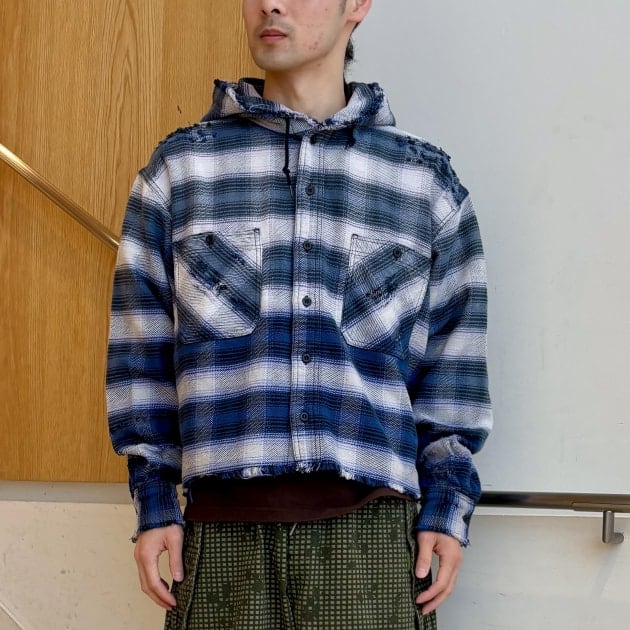 ジャケットの加工感に負けない存在感のあるフードチェックワークシャツ。