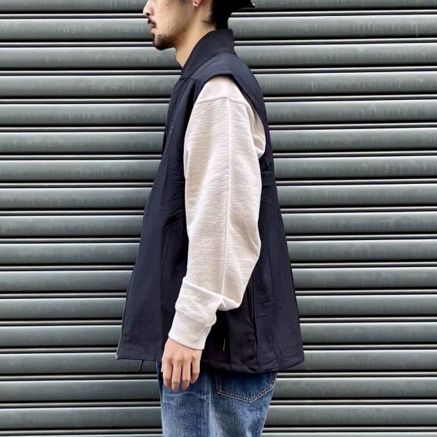 適度な膨らみのある生地感がシルエットをきれいに保ってくれます。テック感のあるベストとのコントラストが、スタイリングにメリハリを。
