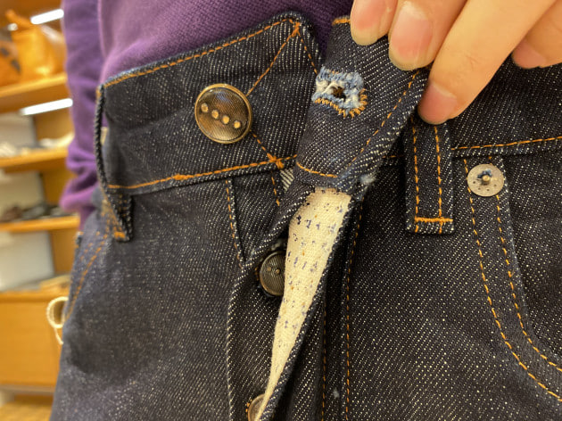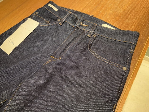 生地は、濃いインディゴでコットン99%、ポリウレタン1%の若干伸縮性のある生地感です。