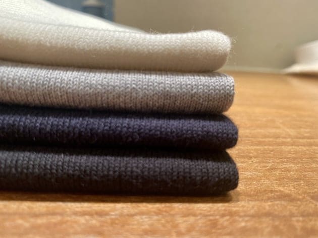 カラーは、コーディネートに適した4色です。ヤーンダイ(糸染め)なのでコットンの雰囲気、そしてハリがあります。