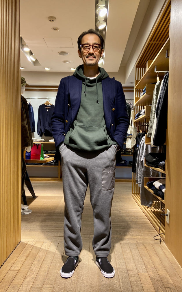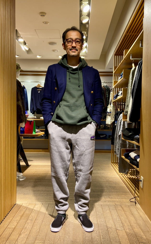 スウェットパーカーにイージーパンツでも、紺のブレザーを羽織ってお出掛け仕様へ。親しい人へのご挨拶にも最適です。