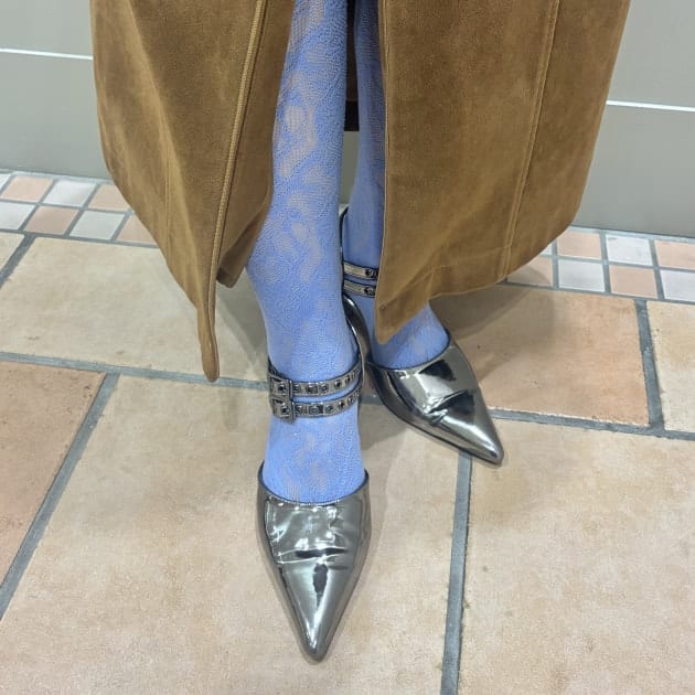 ハードなアイテムに合わせたお気に入りの足元はブルーのタイツにシルバーのヒール♡