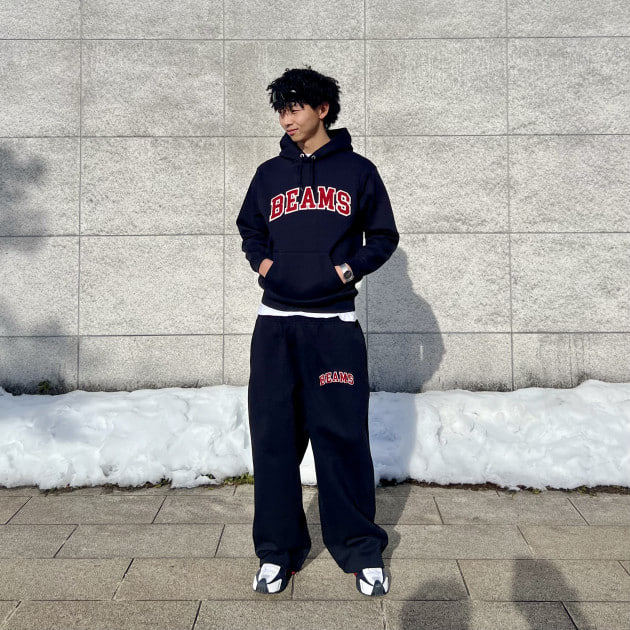 フーディをMサイズにすることで、上下にメリハリが生まれ、ラフなのにだらしなく見えない組み合わせになるのもポイント!