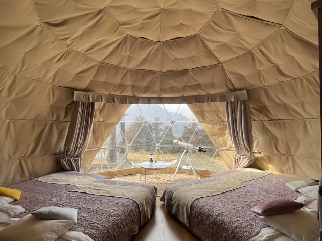 キャンプと違って、しっかりベッドやエアコンが設備されているのがグランピングの良いところです!快適でした〜!