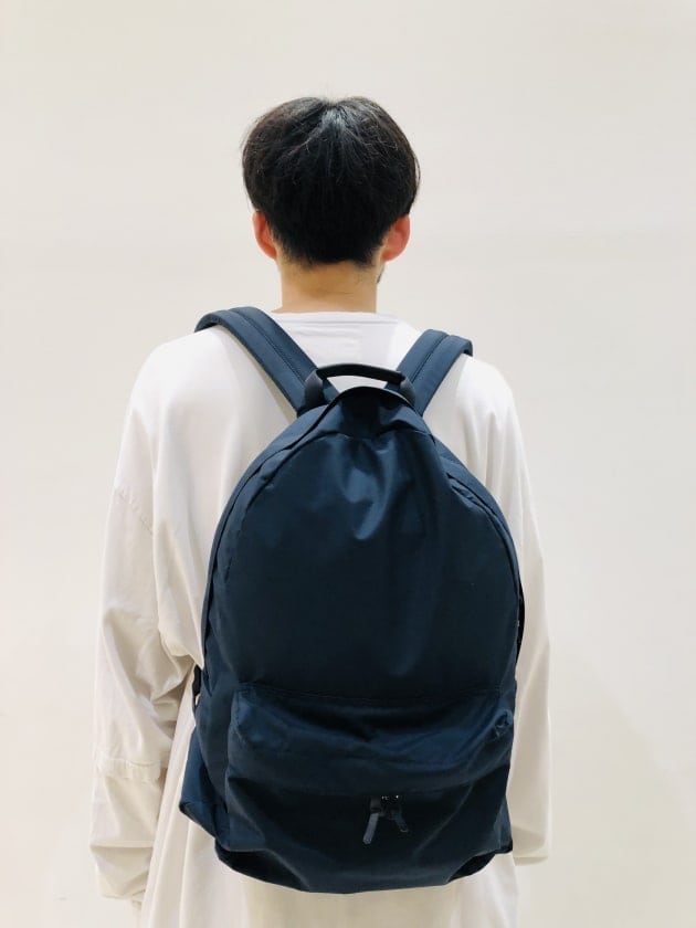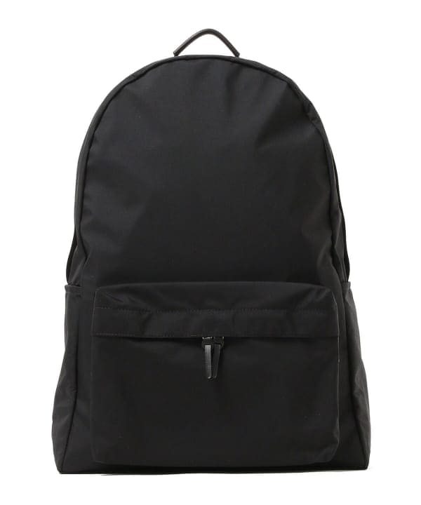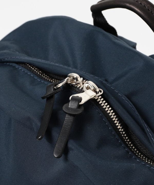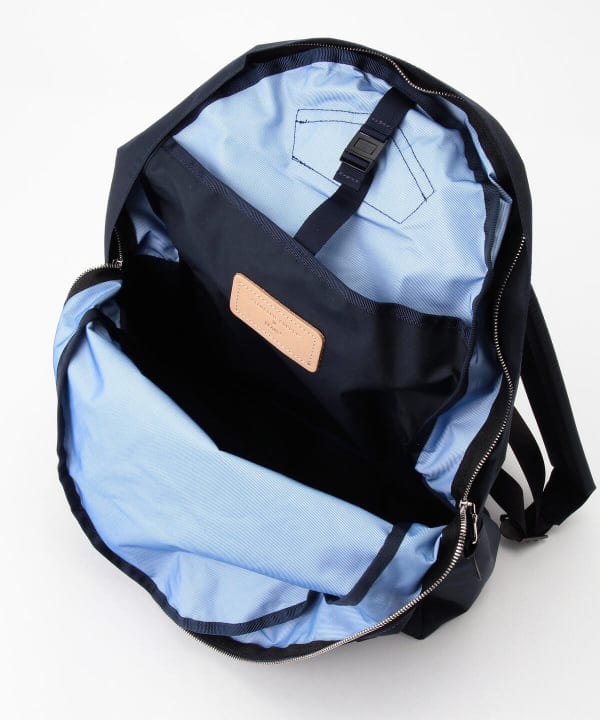 フロントポケットは左右どちらからでも開けやすいダブルスライダー仕様。中には鍵などが付けられるフックと、仕切りポケットを配しています。本体内部の背面にはラップトップPCや書類を分けて入れられる仕切りポケットを付けて、口元はバックルでとめられる仕様です。デイリーに活躍する細部にこだわったデイパックです。