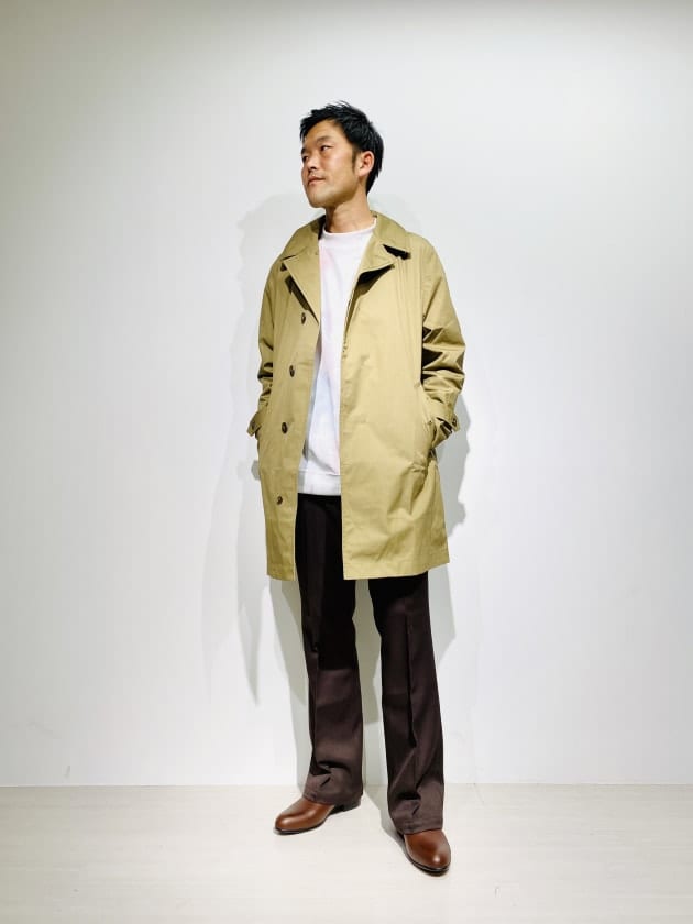 65/35ベイヘッドクロスを使用した、春夏仕様のステンカラーコート。ポリエステル65%、コットン35%の割合で繊維を融合させており、水分を通しにくいのも特徴。独特なマットな光沢感でクラシカルなデザインなので、カジュアルからスーツの上からも着用可能。