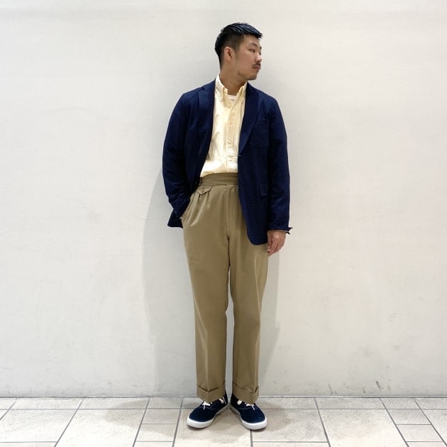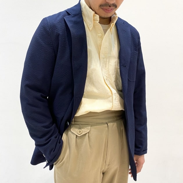 シアサッカーのスポーツコートにボタンダウンシャツ、パンツはやはりチノトラウザーで間違いないですが、少しアクセントとしてグルカディテールのトラウザースをチョイスしてます。